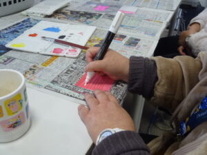 次に、画用紙に絵の具で色を塗って色紙を作り、